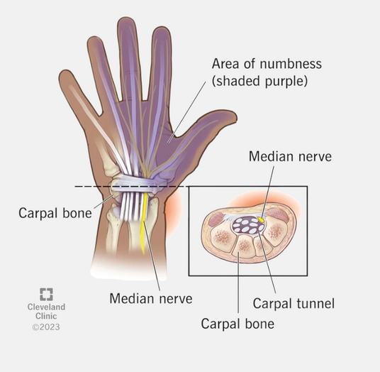 Carpal tunnel syndrome is pressure on the median nerve – the nerve in the wrist that supplies feeling and movement to parts of the hand. It can lead to numbness, tingling, weakness, or muscle damage in the hand and fingers.